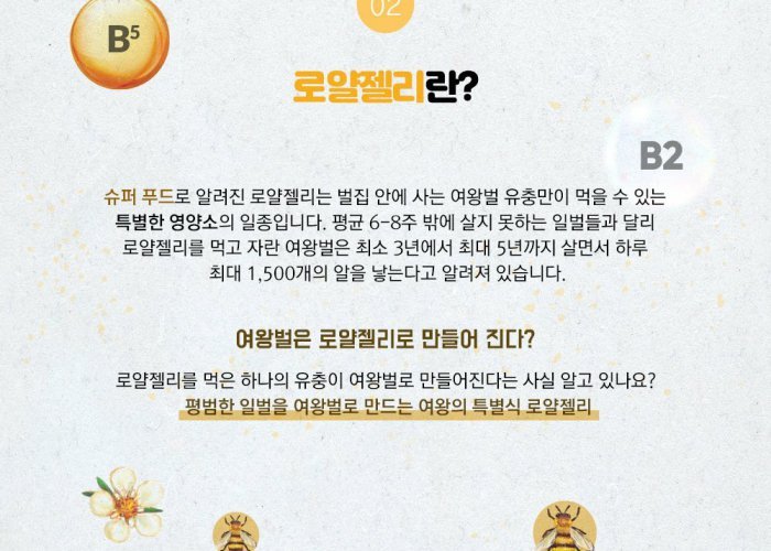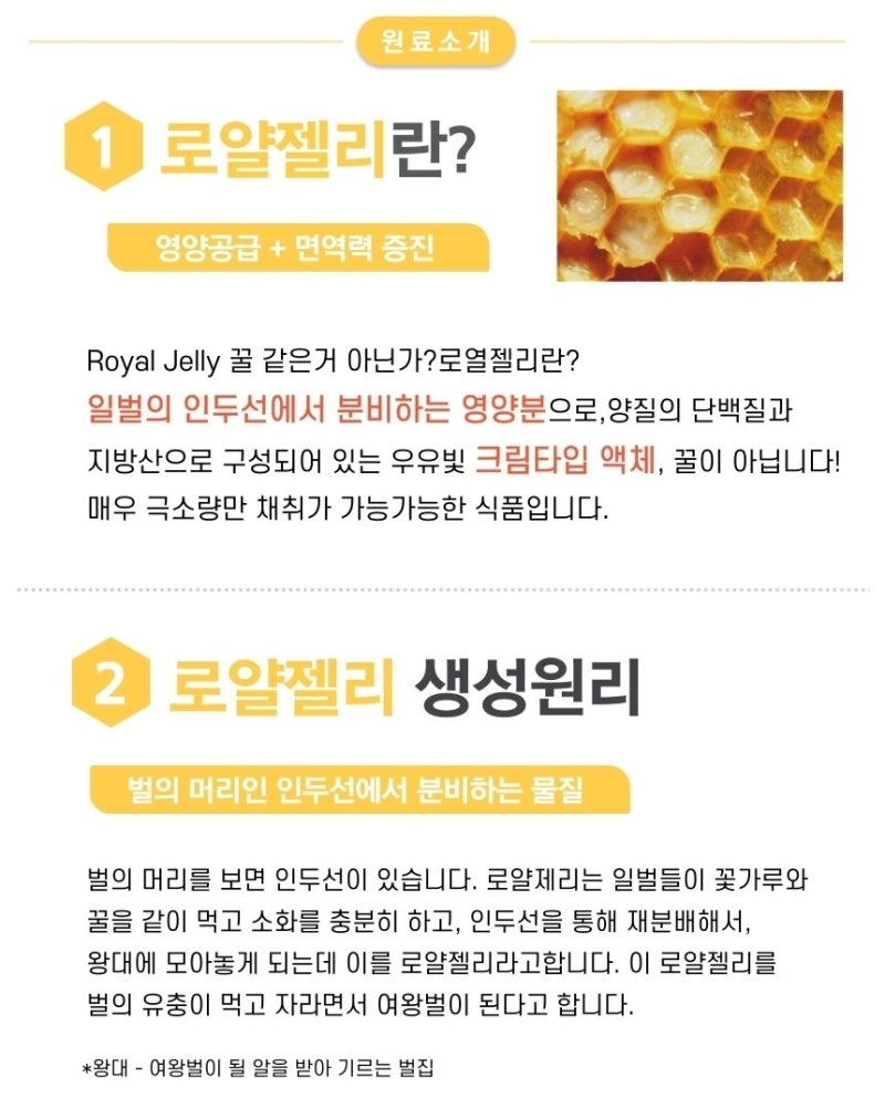 생로얄젤리란? 일벌이 꽃가루와 꿀을 소화한 후 머리의 인두선에서 분비된 여왕벌 유충에게 특별히 공급되는 특별식입니다