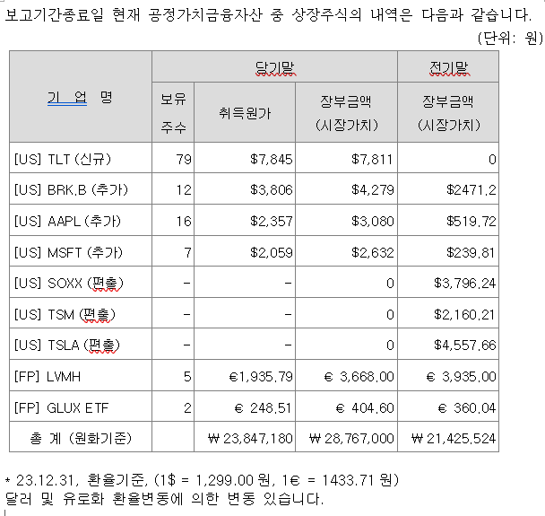 작년 이맘때 환율을 보면 1달러 = 1,261원, 1유로 = 1,349원인데, 작년에는 달러가 강세였음에도 불구하고 원화는 매우 약세였던 것 같아요. 수출이 악화되면서 당연한 결과였을 수도 있겠네요 ㅎㅎ 일부 추가/삭제, 추가구매도 있었습니다. 그 이유도 기록되어 있습니다. 삭제, 포함, 추가 구매기록 및 사유TSLA, SOXX, TSM : 이익실현. 반도체, 자율주행/로봇 모두 좋아 보이지만, 베이스 성장률 측면에서는 헬스케어 투자 비중이 높아진다. TLT 매수 : 2024년 보수적 투자, 금리인하로 인한 얕은 불황을 예상하여 매수. (Hedge) BRK.B 추가 매수: 의심스러울 경우 버크셔를 따르세요. AAPL, MSFT 추가 매입 : 필수소비재에 가까운 기업 추가 매입 포트폴리오 설정 1. 이연계좌(자식, 시드 2,000) 트리맵을 보면 다음과 같습니다. . 연말에는 양도세 손익 250만원을 상쇄해 미국 장기채권 포지션을 대폭 늘렸습니다. 약 34%. (자녀 통장 현금비율이 0%라 올해는 현금대체로 채권을 가져가겠습니다.) 21년. 자녀 계좌에서 22년 수익을 환산하는 실수를 저질렀기 때문에 23년 수익을 24년 동안 보존하도록 포트폴리오를 수정했습니다. 올해처럼 지수가 30% 이상 오르기는 어려울 것으로 판단된다. 2024년까지는 자녀 이연계좌만 보수적으로 관리해 10% 중반을 목표로 한다. 100% 해외 투자 및 적극적인 자산배분 관리 2. 적금(월수당 20, 원금 1260, 평가액 약 2000) 보육수당/육아수당 저축 포트폴리오를 주식 100%로 공격적으로 운용하고 있습니다. 국내주식+추세추종이 엇갈리는 모습이다. 2024년 운영계획 2024년에도 차일드 이연계좌는 반기별 재조정 외에는 거래가 불가능합니다. (아동수당 저축통장은 국내주식 위주로 되어 있으니 반납 부탁드립니다.) 저는 자본주의의 상승세를 믿으며, 아이가 성인이 될 때까지 아이 통장을 지켜줍니다. 자녀에게 투자하시는 분들은 다양한 방법으로 기록해 보세요… 콘텐츠 자체가 아이들을 위한 금융교육 자료가 됩니다. (이렇게 간단한 사업보고서를 작성해서 인쇄해서 파일로 만들 생각입니다. 꽤 재미있습니다.) 아빠/엄마를 키우시는 투자자 여러분! 올해도 행운을 빕니다^^ 작성방법은 이전 포스팅을 참고해주세요. https://blog.naver.com/lhd1371/222192349469 어린이를 위한 주식투자 : 금융교육자료 만들기 – 간단한 사업보고서 작성 본 포스팅은 PC 화면에 최적화되어 있습니다. 가 되었다. 2020년 5월에 아이가 태어났고, 돈벌이도 못하는 자본가로… blog.naver.com