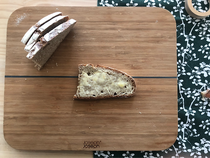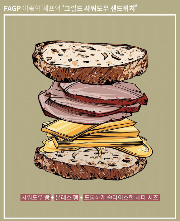 버터를 두른 사워도우 빵의 양면을 팬에 살짝 굽습니다.