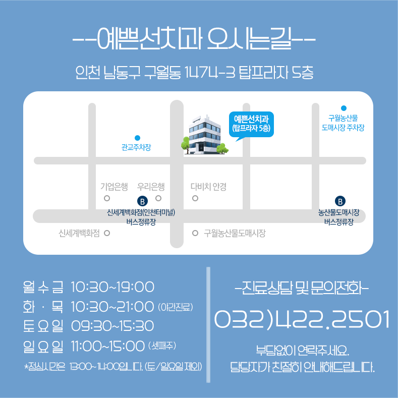 https://mblogthumb-phinf.pstatic.net/MjAxODExMDVfMjc0/MDAxNTQxMzgzNjA5NjUz.vueSmfHTXZBIPAh3gOTM626mGZOkxOXZeCOXF33J6hsg.VCDNzBzLOE0CGeWCZvMdGtkLfpNxcrjnviO93 h7Y V m0g.PNG.sinejusin/%EC%9D%B8%EC%B2%9C%EA%B5%90%EC%A0%95 % EC %B9%98%EA%B3%BC%EC%B6%94%EC%B2%9C_%2810%29.png?type=w800인천교정치과의원에서 추천하는 치아교정은 고정식 또는 가철식 틀니를 이용하여 치아의 배열을 교정하고 깔끔한 인상을 만들어주며 각종 뼈의 문제를 개선하고 부정교합을 예방하며 기능적인 문제를 해결합니다. 교정치료는 여러 가지 이유로 시작할 수 있지만, 치아가 벌어진 경우에는 외형적, 기능적 불편함을 유발할 수 있기 때문에 가능한 한 빨리 교정치료를 시작하는 것이 좋습니다. 간질이란 잇몸뼈와 치아의 크기 차이로 인해 치아 사이에 틈이 생기는 상황을 말하며, 치아 사이에 틈이 생기면 치아의 변형을 촉진시켜 변성을 일으키게 됩니다. 치아의. 또한 씹기가 어려워 음식물이 치아 사이에 끼고 구강위생관리가 어려워지며 음식물을 만지기 쉬워져 소화불량이 유발된다. 구강 질환. 치아가 들어갈 공간이 적어서 치아가 튀어나오는 경우가 있기 때문에 적절한 교정치료를 통해 적절한 위치로 옮겨야 합니다. 치열의 크기에 비해 치아의 크기가 작은 경우, 치아의 크기는 정상이나 턱이 큰 경우, 자연적으로 치아가 충분하지 않은 경우, 잇몸이 치주질환으로 인해 치아가 다른 곳으로 이동한 경우, 손가락을 빨거나 혀로 이를 밀어내는 습관이 있는 경우, 치아가 움직이거나 치아가 앞으로 돌출되거나 돌출된 경우. 자신의 상태를 확실하게 확인하고 싶다면 인천교정치과의원에서 추천하는 교정전문의의 상담과 진단을 받아보시길 바랍니다. 인천교정과는 다양한 요인으로 인해 치아사이가 크게 벌어지는 환자분들에게 다양한 방법으로 적절한 개선을 권해드리고 있습니다. 치아 전체를 덮는 방식으로 발치량은 비교적 많은 편이나 적용 범위가 넓은 것이 장점이다. 라미네이션은 치아 전체를 덮는 치료이며, 발치는 구강 상태에 따라 결정되기 때문에 치아 전체를 덮는 치료입니다. 정확한 진단 후 치료합니다. 나에게 맞는 치료가 궁금하시다면 클리어플러스치과의원을 찾아주세요. 인천교정치과에서 추천하는 곳에서는 치과교정전문의가 직접 상담부터 진단, 치료까지 전 과정을 책임지고 있습니다. 아무거나.디테일. 세분화된 분야에서 통합적인 협력을 진행하고 있습니다. 안심하고 진료를 받으실 수 있고, 보다 완벽한 치료효과를 얻으실 수 있으며, 다양한 구강문제에 대한 부담없는 진료와 개선으로 만족스러운 결과를 얻으실 수 있도록 수준 높은 의료서비스를 제공하고 있습니다. 투명플러스치과의 각 진료과 의료진은 풍부한 임상경험과 숙련된 기술, 전문적인 지식과 다양한 케이스의 치료에 대한 지식을 보유하고 있어 환자 개개인의 특성과 상태에 따라 적합한 개선 방안을 제안하여 보다 나은 결과를 제공하고 있습니다. 연구와 학습을 위해 투명플러스 치과는 월~목요일 저녁 9시까지 운영하오니 방문하실 때 참고하시기 바랍니다.인천광역시 부평구 경원대로 1383 투명플러스치과 3~5층